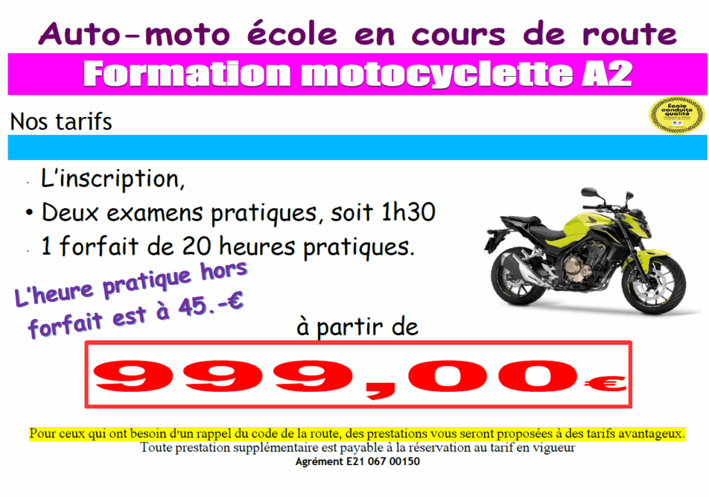 Pour les formations 2 roues : l’élève doit porter lors des séances pratiques une tenue adéquate : un casque et des gants homologués, ainsi qu’une paire de chaussures montantes. Pour sa sécurité, il est également conseillé de porter un pantalon et un blouson. Lors des examens moto, ces équipements sont obligatoires.