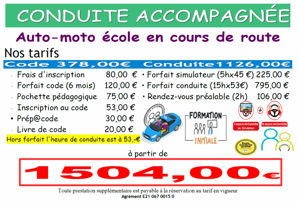 Les horaires de cours pratiques seront programmés en fonction des disponibilités des enseignants et de celles de l’élève. Toutefois, toute leçon non décommandée dans les 48 heures pourra être facturée à l’élève si celui-ci ne justifie pas d’un motif valable (justificatif médical).