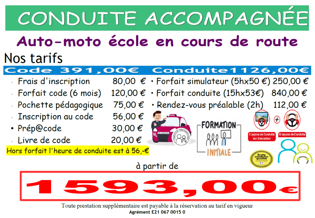 Le coût de la formation , objet de la présente, s’élève à 1593,-€ prix de base, sans les rendez-vous pédagogiques obligatoires. Ces prestations seront facturées à la réservation soit l’un dans cinq à six mois, et le second avant son passage à l’épreuve finale du permis de conduire.